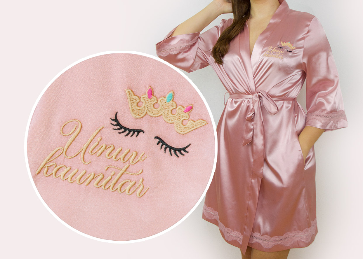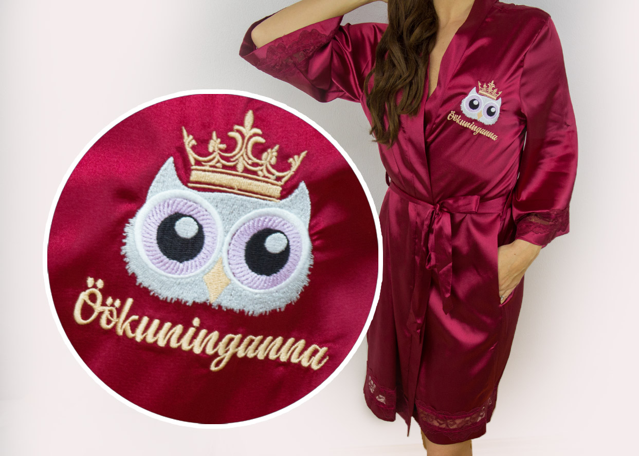 Meie klientide lemmikuks saanud satiinist hommikumantleid kaunistavad meie disainitud masintikandid. Valikus on erinevaid värvitoone ning kaks erinevat disaini: “Öökuninganna” ja “Uinuv kaunitar”. Pikkade varrukate ja taskutega hommikumantlit kaunistab all servas naiselik pits. Pakime hommikumantlid alati kenasti kinkekarpi, millega kingituse üleandmise hetk erilisemaks muuta. Nii ei pea ka teie pakendamisega vaeva nägema. Kui sul on endal lahe idee, mida hommikumantlile tikkida võiks ja soovid kingitust veel personaalsemaks muuta siis võta meiega ühendst. Koos leiame kindlasti sobiva lahenduse!