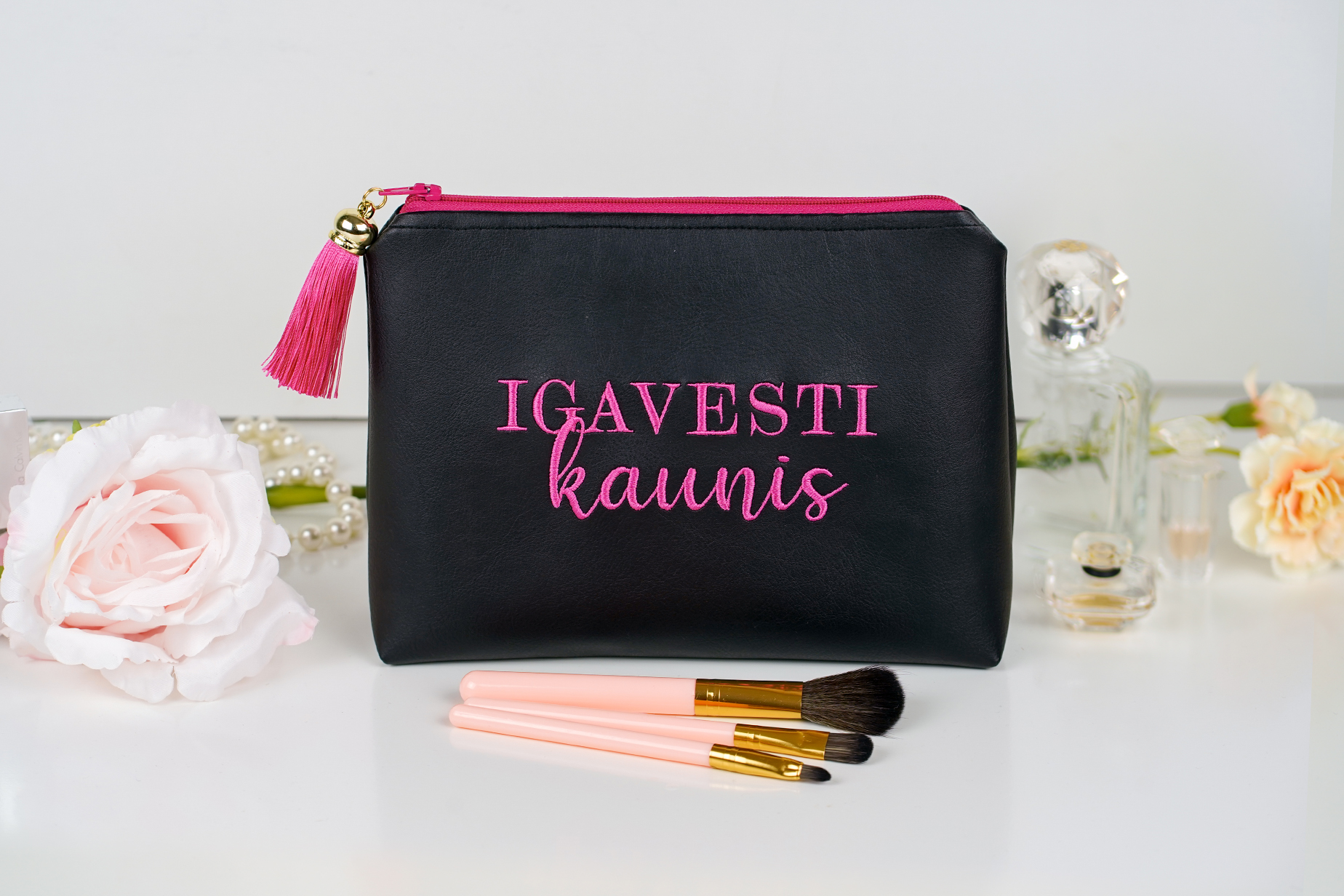 Käsitööna valminud kosmeetikakott tikitud sõnumiga