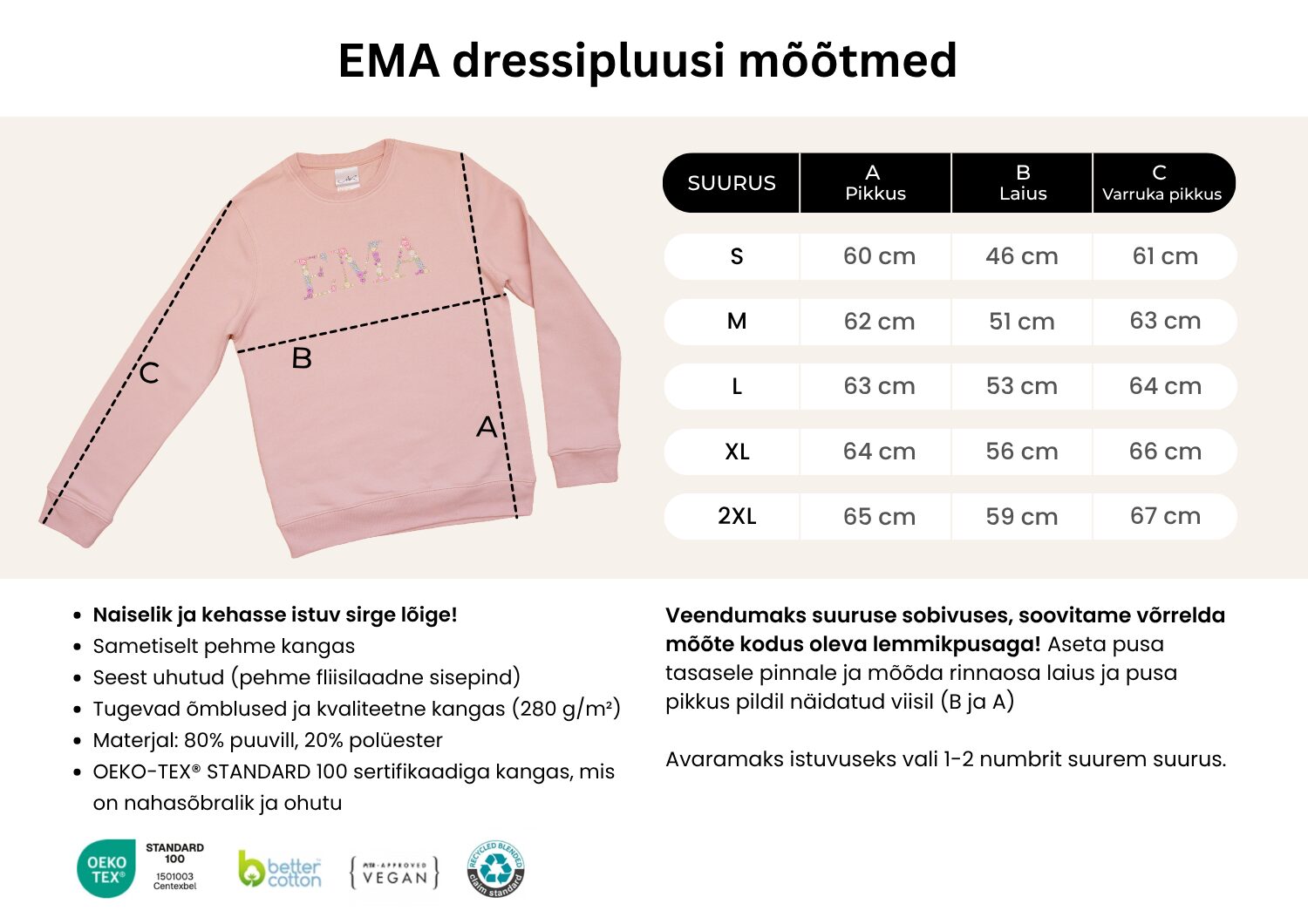 Dressipluus tikitud sõnaga “EMA”, mis moodustub lilledest. Personaalsuse lisamiseks saame varrukale tikkida laste nimed. Imeilus õrn ja naiselik disain sobib ideaalselt kingituseks emale emadepäevaks, sünnipäevaks või jõuludeks! Tänu masintikitud kujundusele on toode kvaliteetne ja vastupidav ehk peab hästi vastu masinpesule ja säilitab oma kauni välimuse ka peale mitmeid pesukordi! Kaunis kingiidee emale emadepäevaks!
