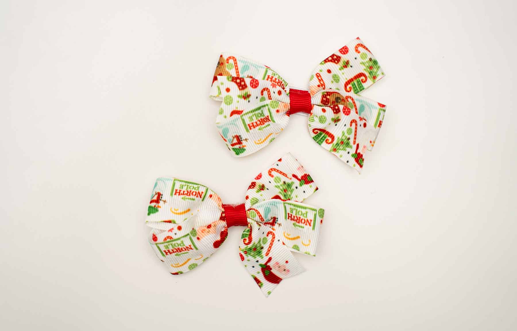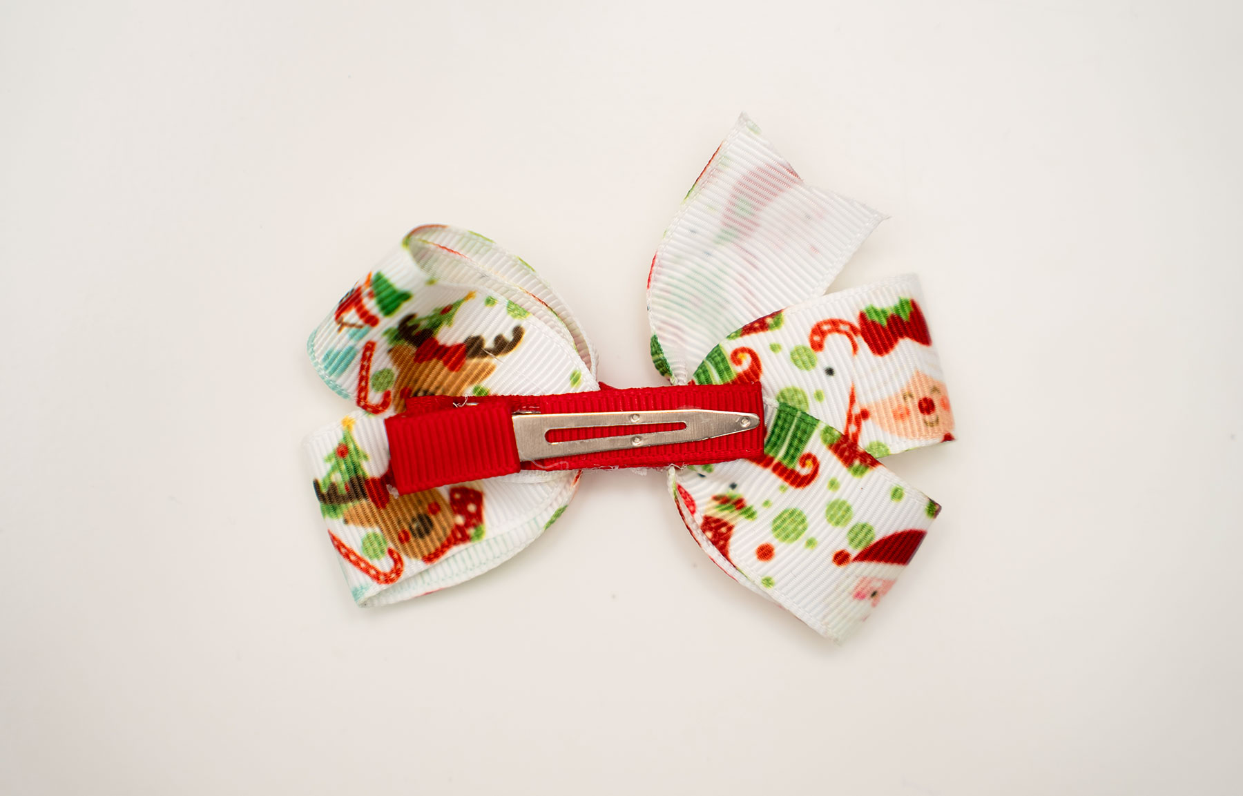 Laste jõuluteemaline juukseklamber – valge lipsuke jõuluvana ja piduliku mustriga. Täiuslik aksessuaar lastele jõulupidudeks ja talviseks pidulikuks kandmiseks.