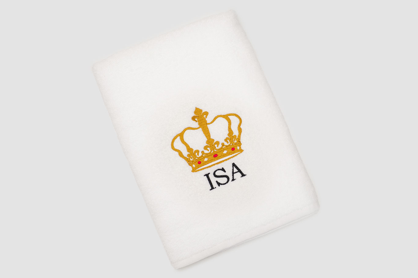 - Pehme 100% puuvillane froteerätik, tikitud kuldse krooni ja sõnaga “ISA”.